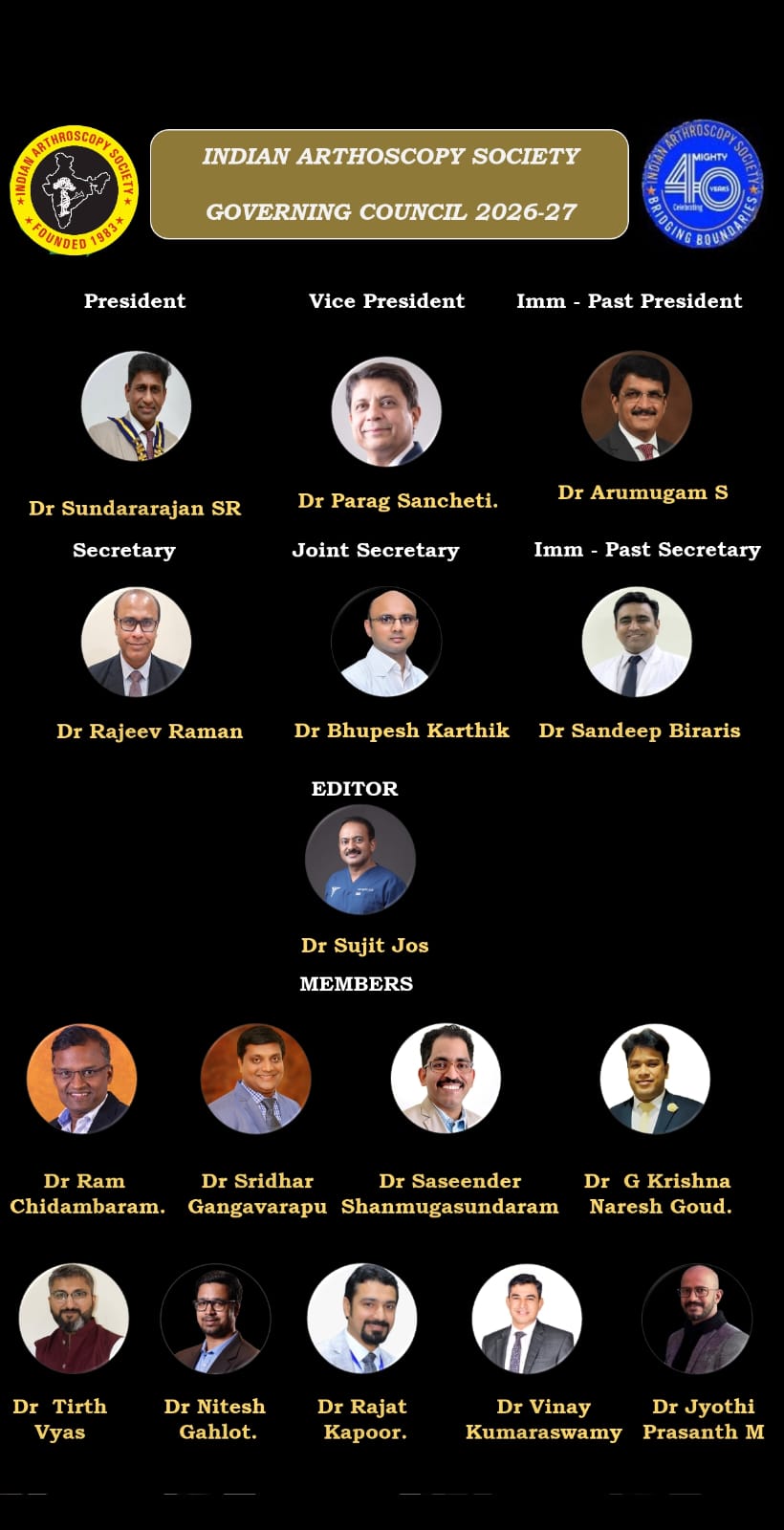 Arthroscopy was started in India for the first time in 1979 in Mumbai by Dr.Pravin Vora who was trained by Dr.Dinesh Patel, Dr.Robert Jackson & Dr.M.Watanabe. Indian Arthroscopy Society was formed on 1st January 1983 with eleven founder members under the able guidance of its patron Dr.Dinesh Patel. Dr.Pravin Vora was entrusted to draft its constitution which was subsequently adopted in May 1983. It was formally registered as a society in 1983 in Mumbai.
